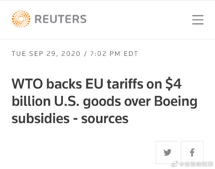 路透:WTO授權歐盟對美國價值40億美元產品加征關稅