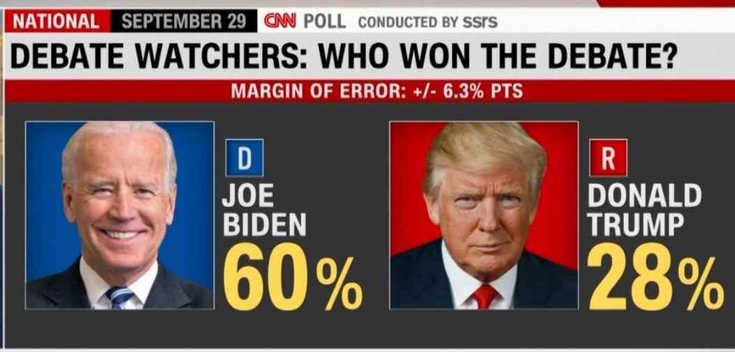 辯論後的調查結果與2016年特朗普和希拉里·克林頓之間的首次辯論後的民意調查結果大致相同。在那次民意調查中,有62%的人認為希拉里贏得了辯論,27%的人認為特朗普贏了。
