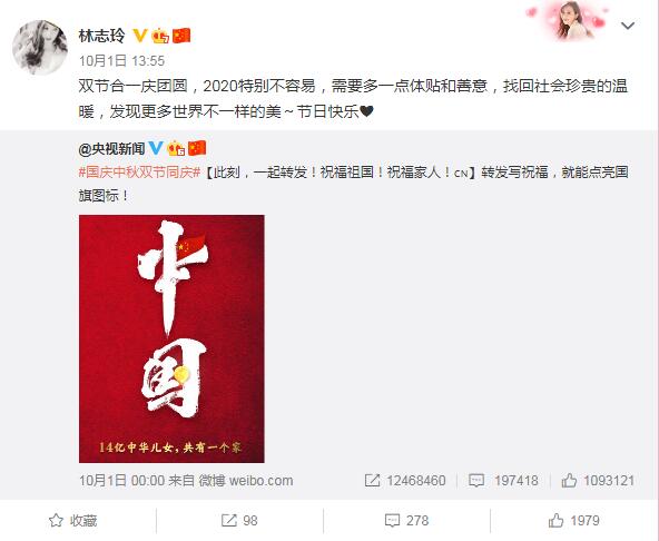 親綠媒體「三立新聞網」10月2日稱,林志玲1日在微博轉發央視新聞的「祝福祖國」帖文,並寫下「雙節合一慶團圓,2020特別不容易,需要多一點體貼和善意,找回社會珍貴的溫暖,發現更多世界不一樣的美~節日快樂」