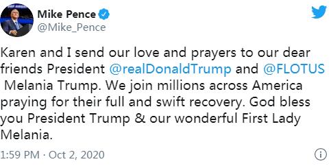 彭斯刚刚发推回应,称他和他的妻子向特朗普和梅拉尼亚送上「爱与祈祷」。
