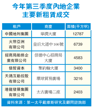 第三季度的大手買賣中,有一半來自中資,該行認為這種趨勢會延續下去。與過去有所不同的地方在於,接下來中資的目標不僅僅局限於中環,上環、九龍東等地的優質商廈,也會成為洽購對象。