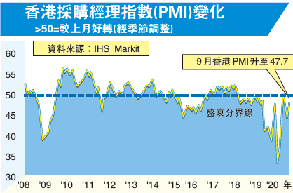 9月份IHS Markit香港採購經理指數(PMI)升至47.7,按月上升3.7,是3個月最高,但仍低於50的擴張收縮分界線。調查指,由於防疫措施限制社交距離延長,但有個別限制因疫情趨緩,而作出調整,因此香港私營經濟於第三季尾的景氣度雖持續惡化,但跌幅已收窄。