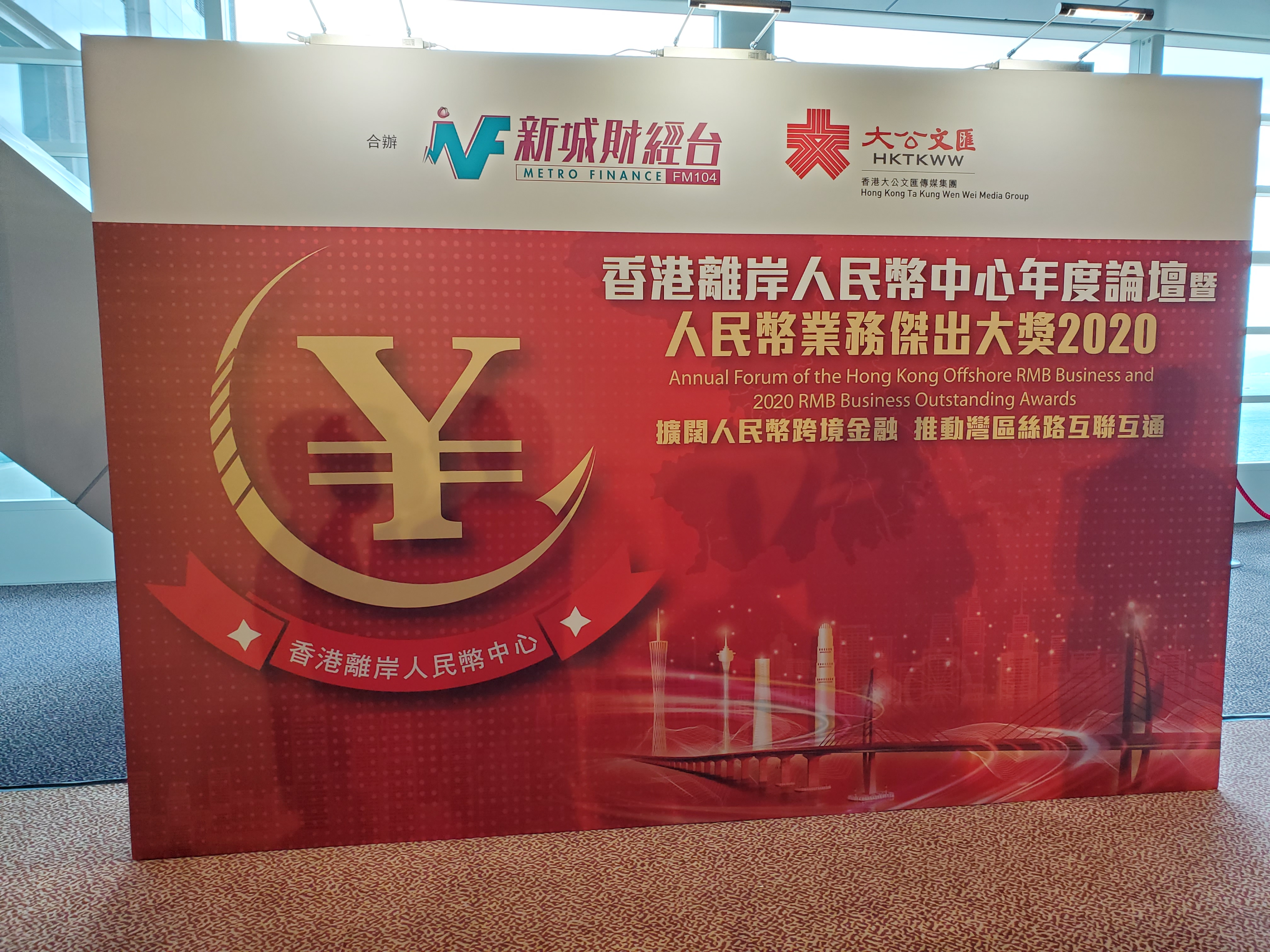 《香港離岸人民幣中心年度論壇暨人民幣業務傑出大獎2020》由香港大公文匯傳媒集團和新城財經台合辦,大會並向多家金融機構頒發《人民幣業務傑出大獎2020》,獲獎機構包括交通銀行(香港)、恒生銀行(011)、中銀國際、中銀人壽及易方達資產管理(香港)等。(記者 鄺偉軒)