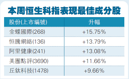本港科技股本周承接美股納指強勢跑出,阿里巴巴(9988)股價創新高,一度高見293元,本周累升3.85%,報286.2元;騰訊(700)揚5.47%報539.5元;小米(1810)升2.45%,報20.95元;京東(9618)漲4.77%,報307.8元。