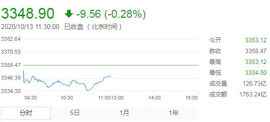 10月13日,农历八月廿七。今日A股三大指数小幅低开,开盘后维持弱势调整,临近午盘时,走势有所转强,走出一波快速上冲行情,创指、深成指拉升翻红。盘面上,新能源、军工板块较为强势,疫苗、医疗器械涨幅居前。总体上,个股跌多涨少,整体市场情绪一般,赚钱效应有所减弱。北上资金上午暂停交易。截至上午收盘,沪指跌0.28%,报3348.90点;深成指涨0.18%,报13733.17点;创指涨0.19%,报2782.64点。