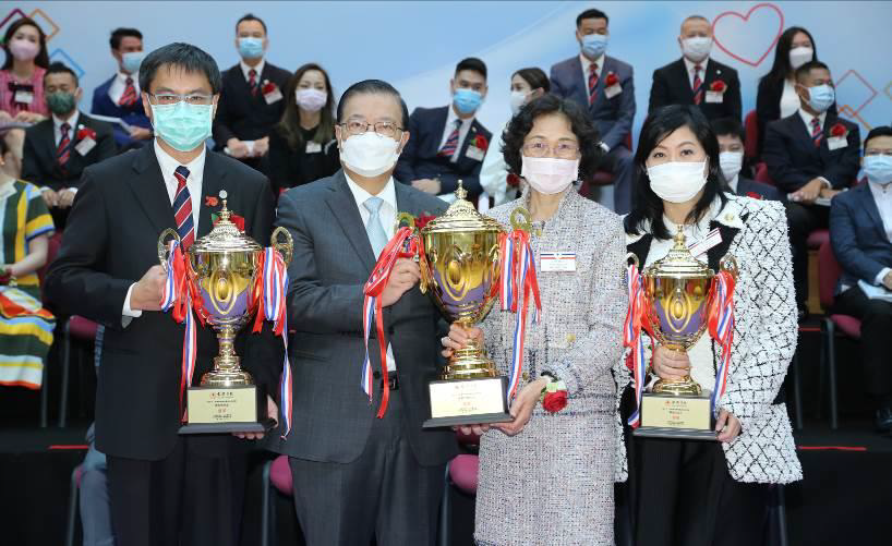 圖為全國人大常委譚耀宗頒發第52屆董事局全年「最高籌款奬」,冠亞季軍分別為王賢訊主席、葉恭正副主席及周松東副主席。