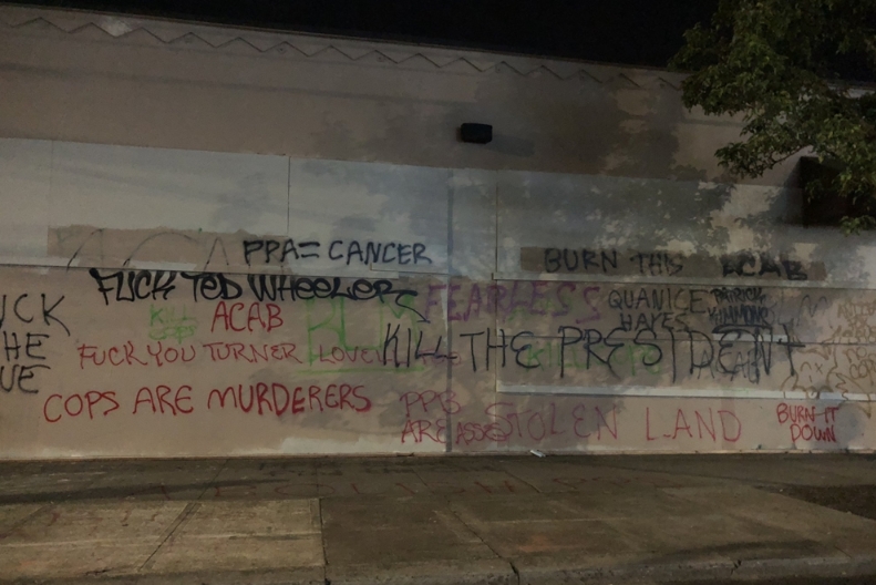 美國俄勒岡州波特蘭市的示威活動已持續近130天,近日,騷亂不斷升級。當地時間10月20日淩晨,示威者將波特蘭警察局的廣告牌潑漆並縱火燃燒,還有示威者在警察協會大樓外圍木板上塗鴉,標語寫着「殺死總統」。