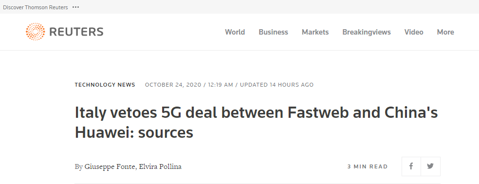 路透社稱,這是迄今意大利對華為採取更強硬立場的最新跡象,標誌着意大利首次否決與華為簽署5G核心網絡供應協議。
