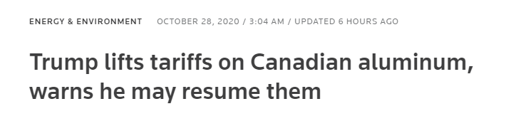 特朗普於2019年首次批准對加拿大進口鋁免除關稅,但加拿大非合金,未鍛造的鋁的進口量激增促使他於8月重新徵收關稅。