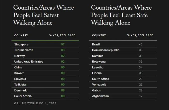 其中,蓋洛普單獨列出了「獨走夜路感到安全」的指數。在這項排名中,有90%的中國人「獨走夜路時感到安全」,在全球所有國家和地區中,排名第5。