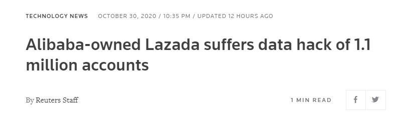 據路透社消息,阿里巴巴(09988)旗下東南亞電商平台Lazada表示,公司的一個部門遭黑客攻擊,姓名、電話號碼、加密密碼和部分信用卡號碼等客戶數據被洩露。