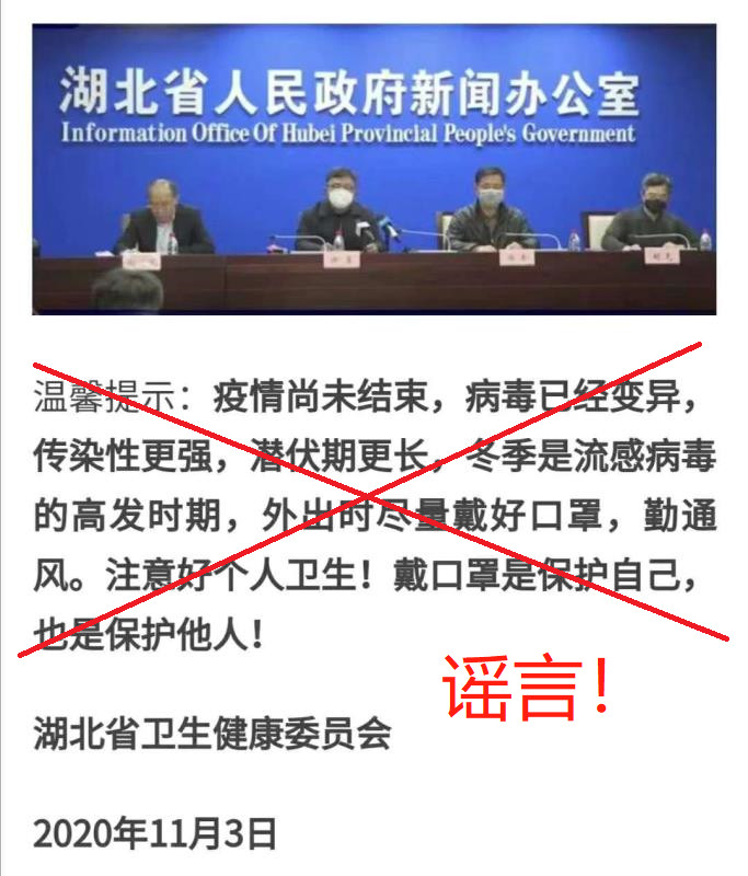 經核實,湖北省衛生健康委未發布以上消息,純屬謠言,請廣大群眾不信謠,不傳謠,保持良好心態,關注官方公布的權威疫情防控知識,科學做好個人防護。