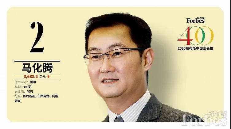 騰訊CEO馬化騰以3683.2億元位居第二,農夫山泉創始人鍾睒睒以3596.5億元排名第三。