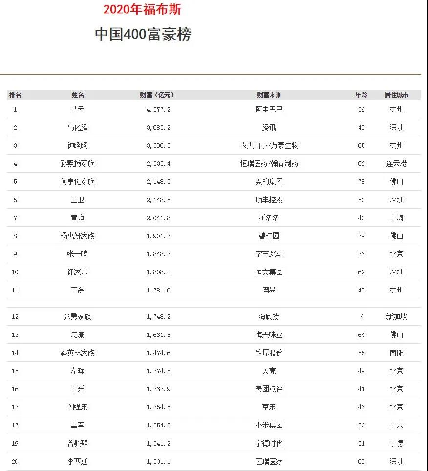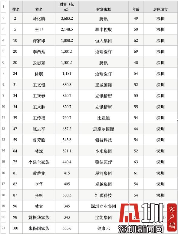 馬化騰、王衛、許家印等前三位深圳富豪進入全國榜單top10。