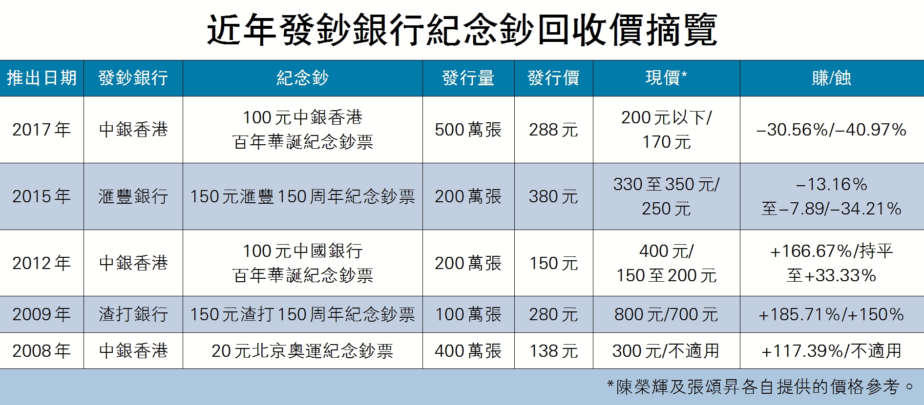 近年本港三間發鈔行先後推出周年紀念的紀念鈔,從過去15年計,以中銀香港(2388)推出的紀念鈔的款式最多。中銀香港共發行過三款紀念鈔,分別為2008年的20元奧運紀念鈔票、2012年中國銀行百年華誕紀念鈔票及2017年中銀香港百年華誕紀念鈔票。