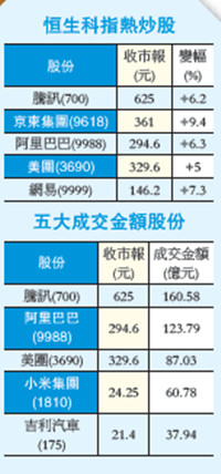 受上述影響,恒生科技指數昨日接續跑贏大市,當天大漲422點或5.45%,收報8181點。其中,騰訊(700)創新高,收升6.2%,報625元,成交達160.58億元居首;前天捱沽的阿里巴巴(9988),昨天則勁彈6.3%,報294.6元。兩股合共貢獻恒指達249點。美團(3690)繼續破頂,收升逾半成,報收329.6元。據報由京東集團(9618)分拆出來的京東健康將在港上市,最快下周進行上市聆訊,並在12月招股。消息指,京東健康集資最多30億美元(逾230億港元),目標估值約200億美元。受消息帶動,京東曾高見361.8元,升逾9%,亦創上市新高。