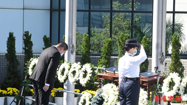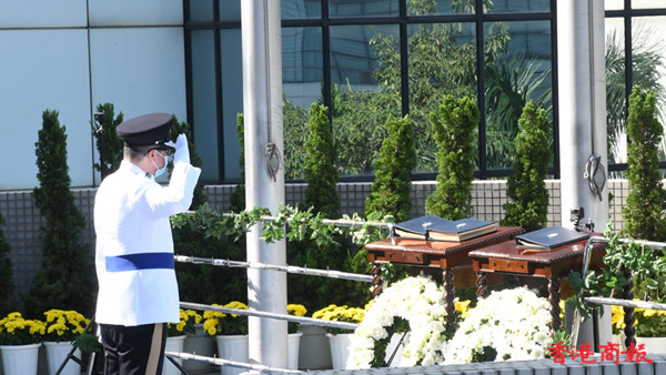 鄧炳強致辭完畢後,眾人一起默哀兩分鐘,之後由鄧炳強帶領各代表逐一向因公殉職的警務人員獻上花圈。(記者李銘欣、刘深)