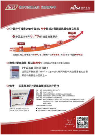 高血壓是腦卒中(俗稱中風)的最重要危險因素,因此兩者關係十分密切。在中國,由於基因和飲食生活習慣等原因,約75%高血壓合併血漿同型半胱氨酸(Homocysteine,Hcy)升高,此即H型高血壓,是一種更容易引起卒中的高血壓類型。據國家衛生健康委員會數據顯示,中國因心腦血管病導致的死亡佔居民總死亡的40%以上,其中約70%腦卒中死亡與高血壓相關。《中國腦卒中防治報告2019》顯示,目前腦卒中發病率以8.3%速度攀升,每年約有190余萬人因卒中死亡,形勢十分嚴峻。「依葉」是治療H型高血壓的首選藥物,其預防卒中效果有循證醫學研究的強力支持,預期在市場推廣中將大放異彩。