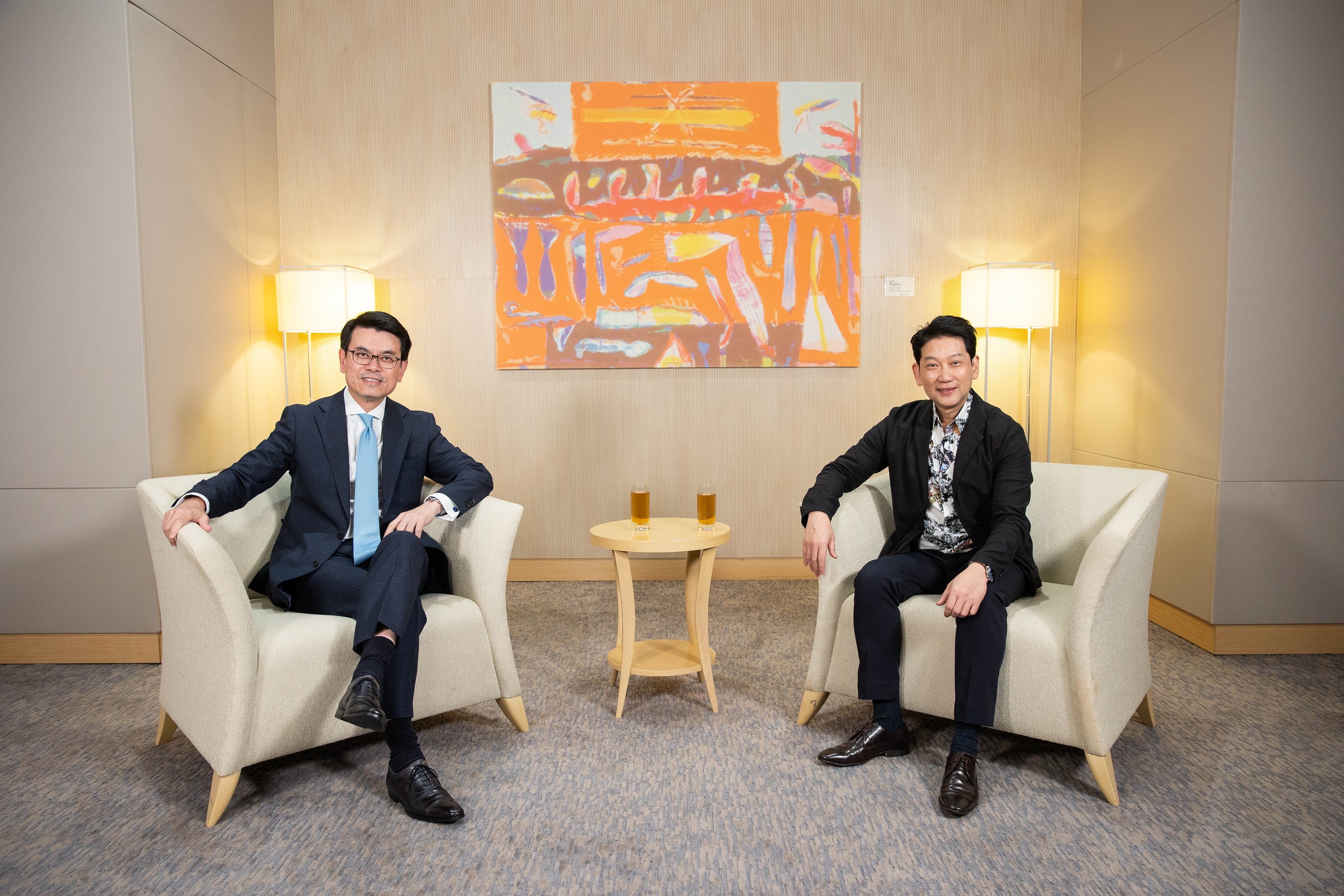 邱騰華(左)擔任《Talk Shop》首集嘉賓,與楊立門(右)分享對重啟經濟的看法。
