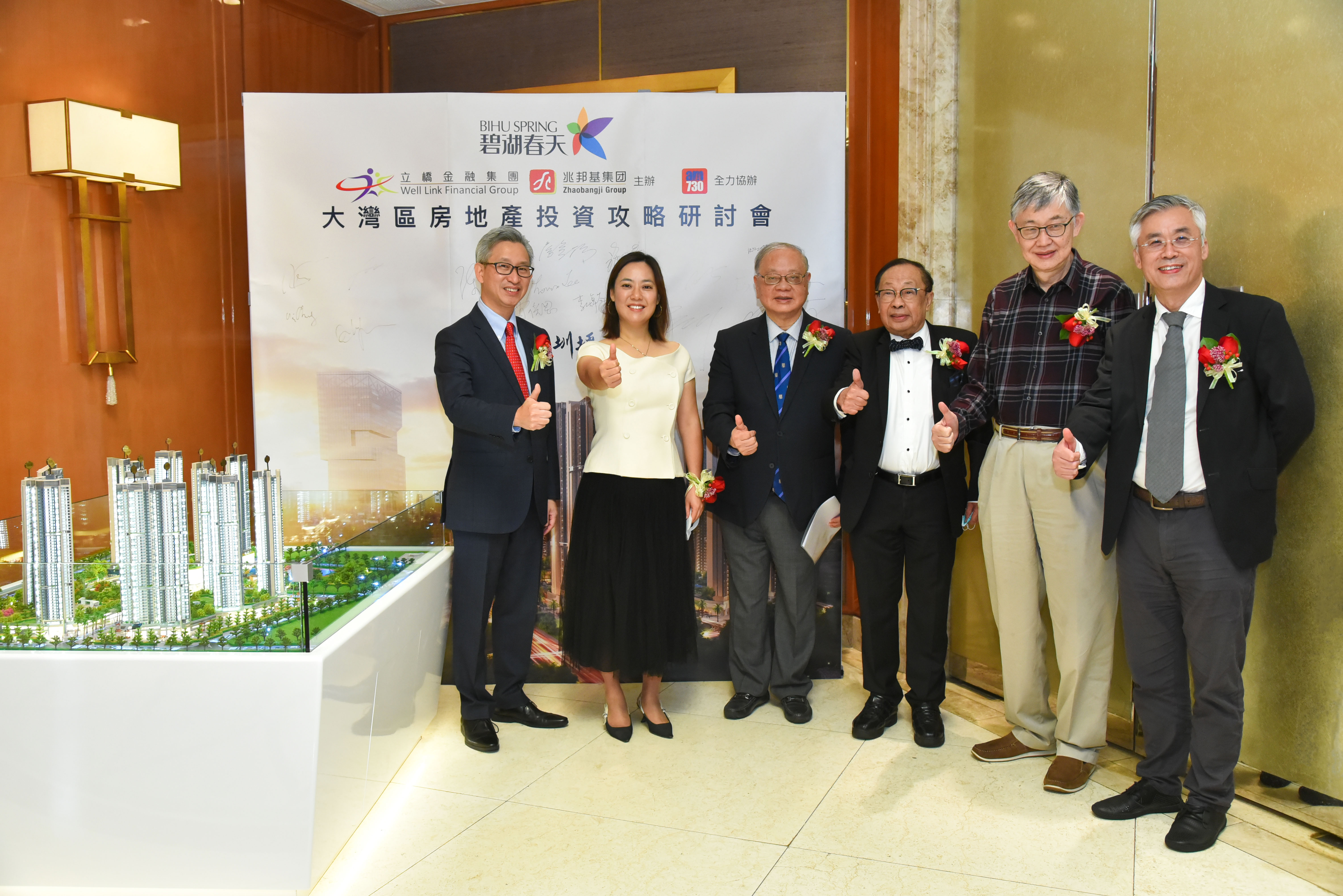 六位講者在碧湖春天沙盤旁合照,左起李滿能、詹美清、李焯芬、陳清泉、施永青、賈倍思。