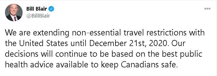 當地時間19日,加拿大公安部長比爾·貝理雅通過社交媒體宣布,將加拿大與美國之間的非必要跨境旅行限制措施延長到2020年12月21日。