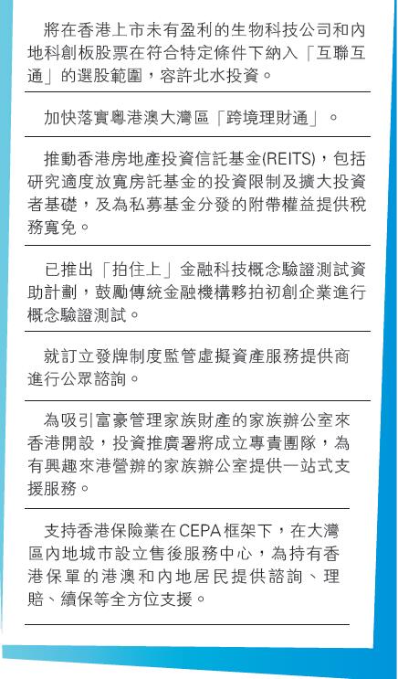 林鄭月娥在施政報告中,未有提及「跨境理財通」的落實細節,細節將留待金管局公布。她強調,落實時要保持金融風險可控。據金管局早前透露,「跨境理財通」將分為「北向通」和「南向通」兩部分,計劃各設置1500億元(人民幣,下同)總額度,個人額度為100萬元。