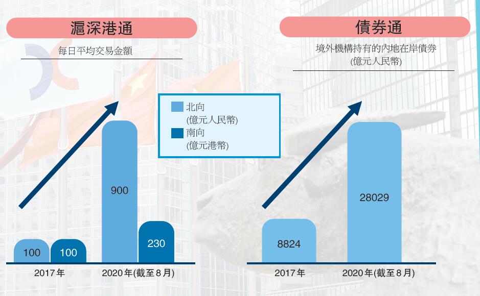 先回顧各項「互聯互通」的開通時間。2014年,「滬港通」開通;2016年,「深港通」開通;2017年,「債券通」北向部分開通。上述3項「互聯互通」中,首兩項是各地市場之間的「互聯互通」,餘下一項則是產品之間的「互聯互通」。