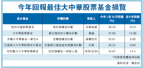 據積金局網頁的「強積金基金平台」最新資料顯示,16隻大中華股票基金中,有9隻截至10月底的近一年回報達30%以上,其中最高頭三位分別是:中銀保誠的「我的中國股票基金」、萬通的大中華股票基金,以及銀聯信託的「安聯大中華基金」,近一年回報分別為38.26%、37.58%及35.75%。