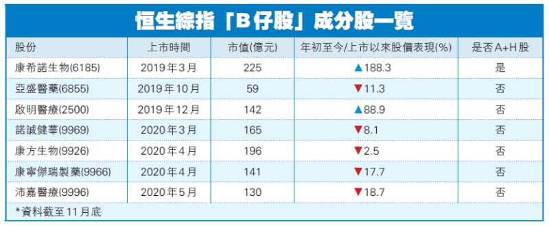 換言之,若以恒生綜指成分股為標準,有7隻「B仔股」符合條件納入「港股通」選股範圍,它們是已獲納入恒生綜指的康希諾生物(6185)、亞盛醫藥(6855)、康方生物(9926)、康寧傑瑞製藥(9966)、諾誠健華(9969)、啟明醫療(2500)及沛嘉醫療(9996),全部市值均高於50億元。
