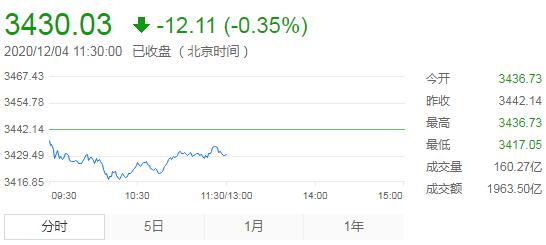 截止午間收盤,滬指跌0.35%,報3430.03點,深成指跌0.01%,報13969.06點,創業板指漲0.33%,報2721.54點。兩市成交額超4500億元;北上資金實際淨流出超5億元。兩市43股漲停,13股跌停。