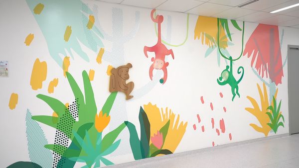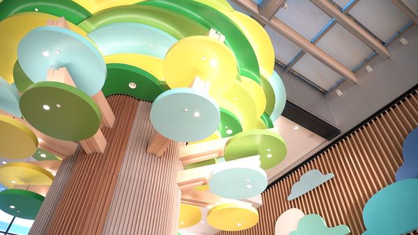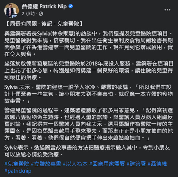聶德權其後引述建築署署長林余家慧指,建築署在設計兒童醫院時營造了一些氣氛,讓小朋友去到醫院時不會害怕,就好像一本立體的動物故事書。林余家慧更憶起當初選取哪些動物做兒童醫院主題時,有一個醫護人員向她表示,選用馬騮作為1樓的主題圖案,因為馬騮喜歡用手飛來飛去,而1樓正是小朋友抽血的地方,他們只要看著、看著,很自然便會把手伸出來讓姑娘抽血。