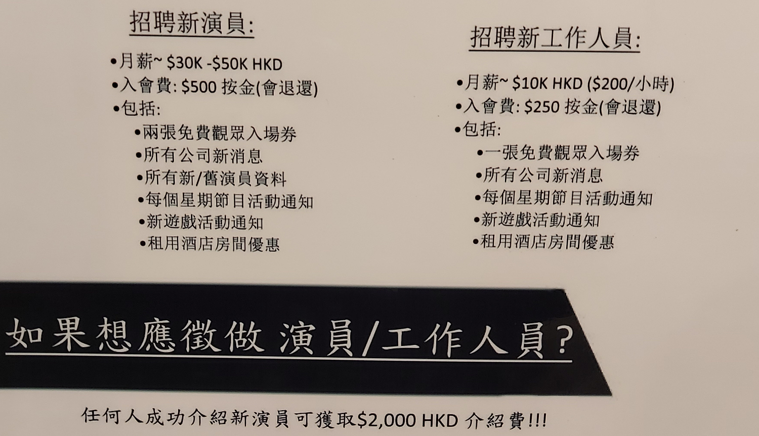 涉案公司招聘受害人時聲稱,月薪可達3萬至5萬元,在「A房」演出每小時約1000元,其他薪酬則另議。此外,招聘的工作人員時薪200元,如介紹演員加入,每人的介紹費是2000元。案中4名男受害人由20歲至31歲,均無參與「B房」的性交易。