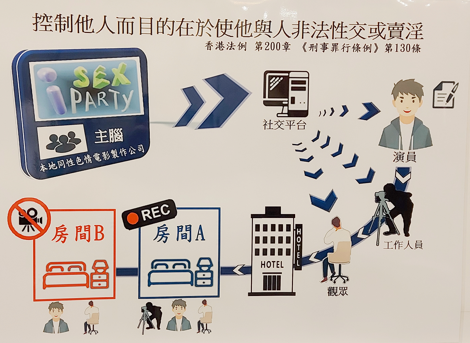 新界南總區刑事部重案組史廣鴻總督察表示,該公司自稱在前年成立,在港並無商業登記和註冊。他們分工仔細,包括在男同志社交媒體招攬年輕受害人、簽訂合約及取得他們的個人資料。另有工作人員負責預約酒店,購買食物、生果或皮製工具,另一批工作人員則在網上招攬一些有經濟能力及好此道者收看付費節目或到現場觀看。其工作流程是先選定酒店,工作人員和受害人會相約在大堂會合,再到已租賃的、他們稱作「A房」的房間做一系列表演,而工作人員則在場拍攝,並在網上直播,觀眾看後可要求指定演員到另一間房間「B房」作性交易。