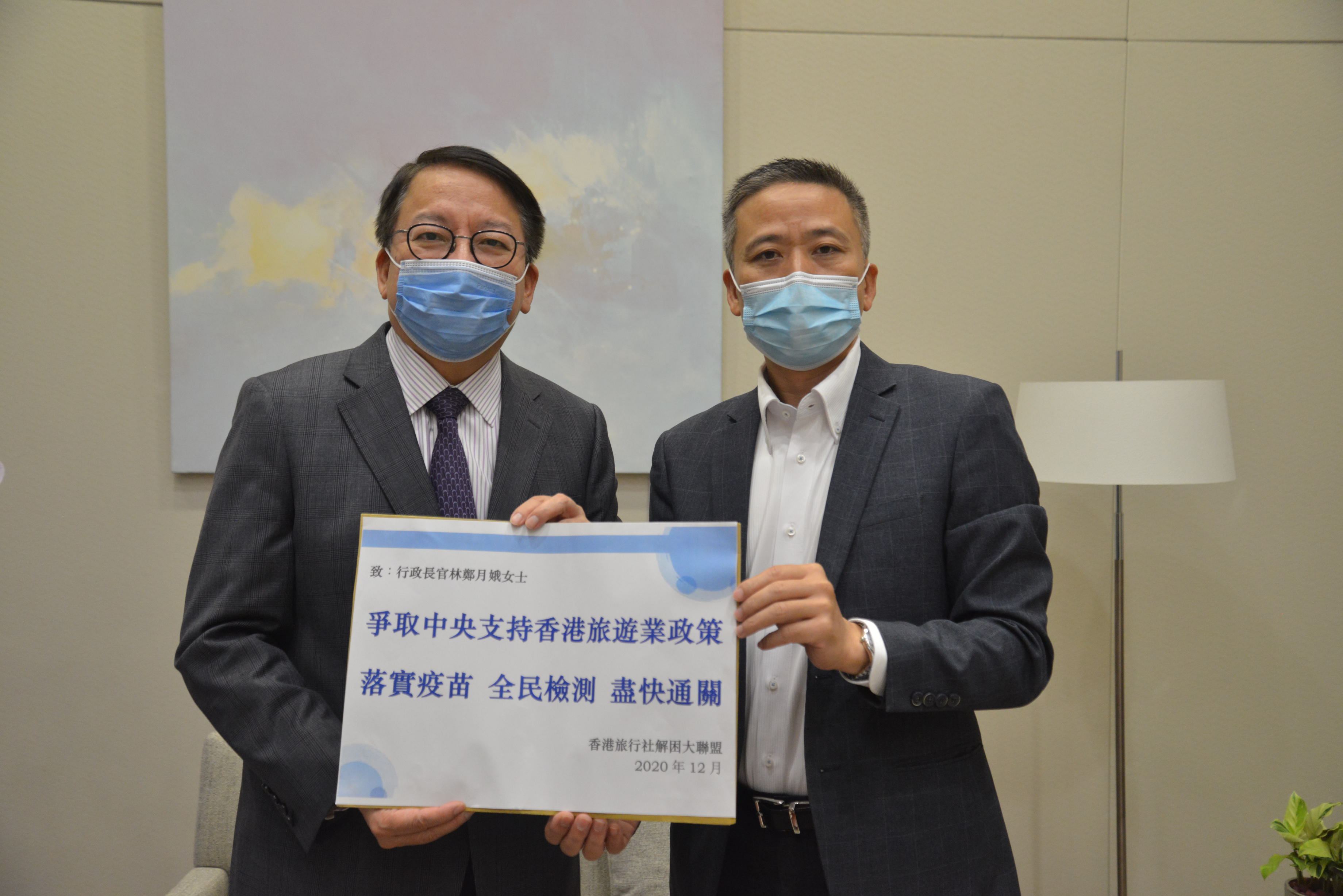 香港旅行社解困大聯盟同時引述行政長官在新一份施政報告中提到下次訪京時,會爭取國家文化及旅遊部繼續支持兩地旅遊合作;而姚柏良則希望行政長官向中央政府反映,在香港的新冠肺炎疫情可控下,盡快放寬海外旅客經香港國際機場中轉至內地目的地限制;中長期可進一步優化簡化邊境通關模式,考慮將香港國際機場與港珠澳大橋無縫對接配套發展的構思延伸至其他陸路口岸,同時爭取內地扶持旅遊業恢復的有關政策,包括旅客獎勵計劃等可擴展至香港旅遊業,並且向中央爭取香港在大灣區旅遊規劃中擔當主導角色,促進香港與廣東省、澳門旅遊合作,加強郵輪區域合作,在明年的十四五規劃強化香港作為國際旅遊樞紐的地位。(記者 唐信恒)