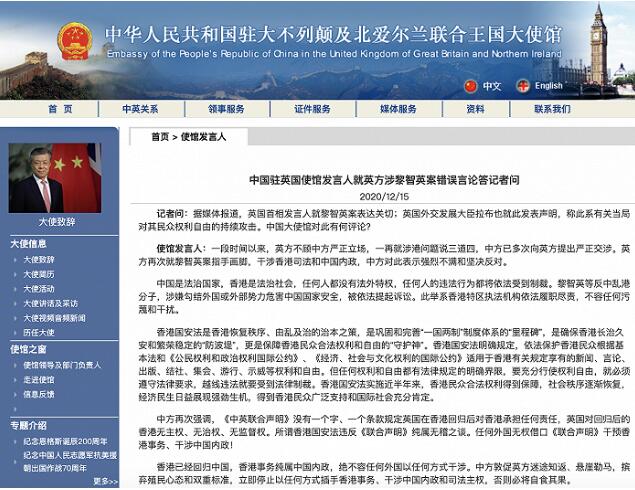 據中國駐英國大使館網站15日消息,針對英國首相發言人及外相就黎智英案發表的聲明,中國駐英國大使館回應指,一段時間以來,英方不顧中方嚴正立場,一再就涉港問題說三道四,中方已多次向英方提出嚴正交涉。英方再次就黎智英案指手畫腳,干涉香港司法和中國內政,中方對此表示強烈不滿和堅決反對。