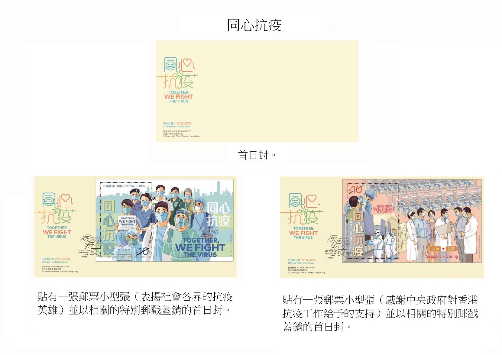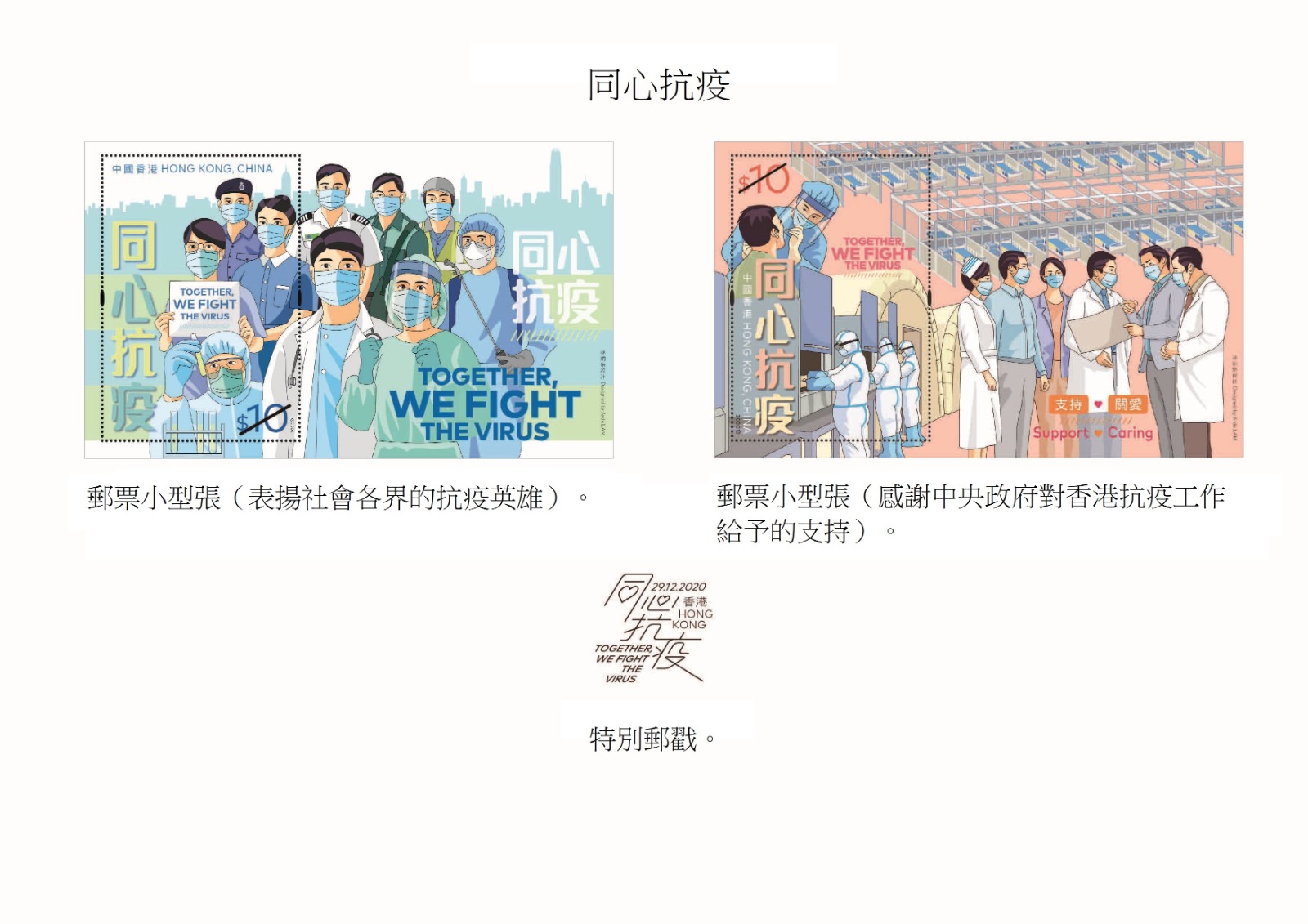 香港郵政指將以「同心抗疫」為題印製兩款郵票小型張,於29日發行,顧客可在明日(16日)起於香港郵政郵票策劃及拓展處網頁(stamps.hongkongpost.hk)及「郵票.郵趣@Hongkong Post Stamps」的社交平台專頁預訂,亦可前往各郵政局索取表格訂購。