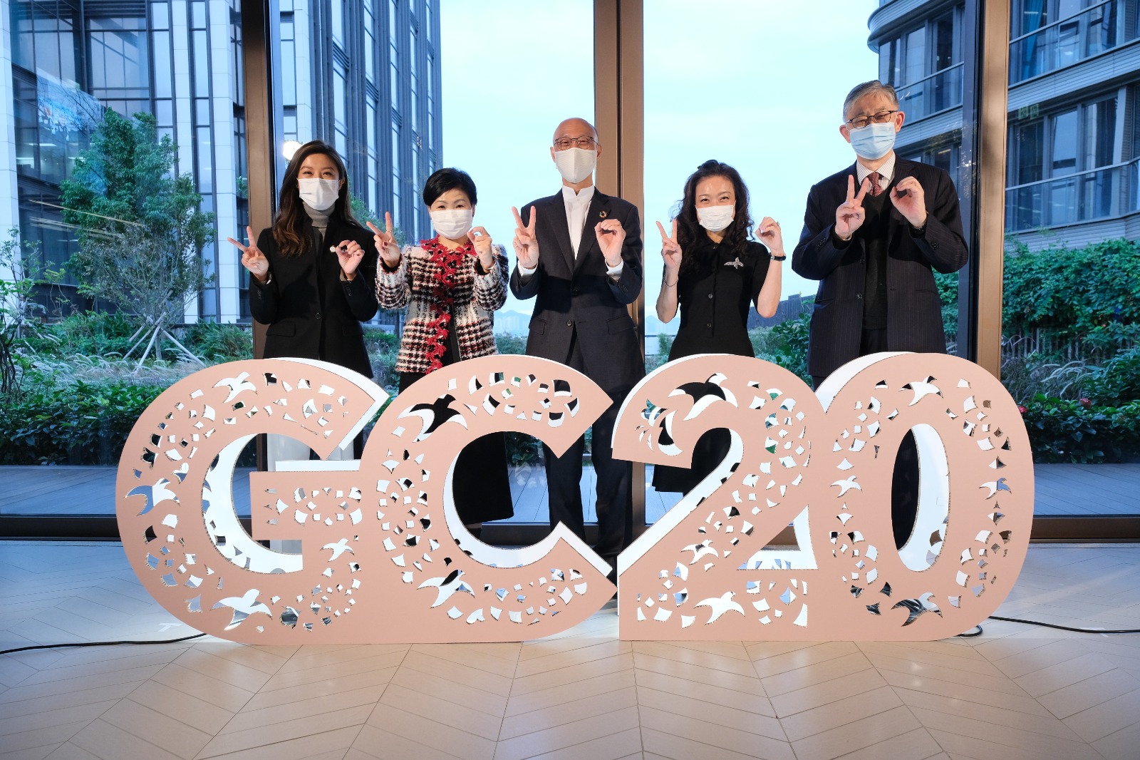 新世界發展可持續發展主管鄧業煒、消費者委員會總幹事黃鳳嫺、香港特別行政區環境局局長黃錦星、論壇主持人環保促進會行政總幹事何惠萍以及環保促進會主席施永青的合照。