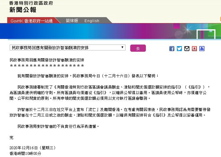 民政事務局說,許智峯於12月3日在社交平台上宣布「流亡」及離開香港。在考慮有關因素後,認為有需要暫停發放許智峯在宣布流亡或之後的酬金、津貼和開支償還款額,以確保有關安排符合指引。並對許智峯的不負責任行為深表遺憾。