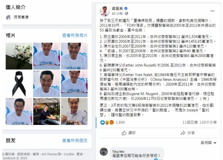 梁振英在帖文中寫到:除了我三天前臚列「壹傳媒股民」揭露的捐款、貸款和其他捐贈外,2011年10月,「FOXY洩密」亦揭露黎智英由2005年至2011年共捐出的53筆政治獻金,當中包括:
