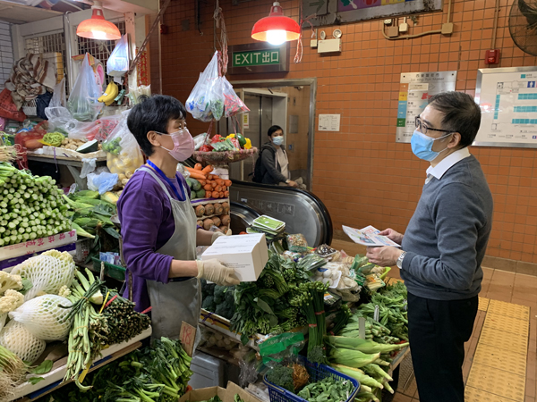 食環署助理署長曾永樂(右)昨日(15日)到訪西營盤街市,向街市檔戶派發口罩及宣傳單張,提醒他們須採取各項防疫措施及遵守防疫規例。