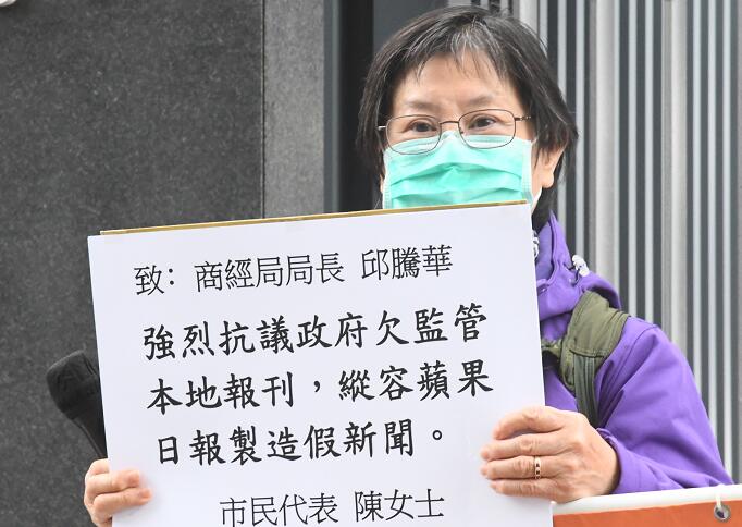 一批市民今日(17日)自發到政府總部請願,抗議蘋果日報多次報道內容偏頗造假,誤導大眾,要求商務及經濟發展局局長邱騰華正視問題,敦促相關部門加強監管及嚴正執法。