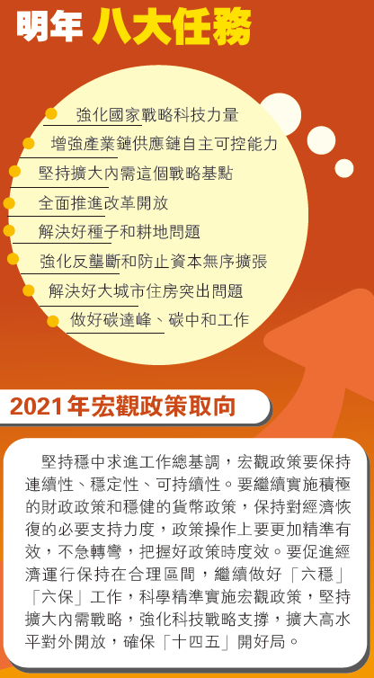 會議指出,明年宏觀政策要保持連續性、穩定性、可持續性。要繼續實施積極的財政政策和穩健的貨幣政策,保持對經濟恢復的必要支持力度,政策操作上要更加精準有效,不急轉彎,把握好政策時效度。要用好寶貴時間窗口,集中精力推進改革創新,以高質量發展為「十四五」開好局。積極的財政政策要提質增效、更可持續,保持適度支出強度,增強國家重大戰略任務財力保障,在促進科技創新、加快經濟結構調整、調節收入分配上主動作為,抓實化解地方政府隱性債務風險工作,黨政機關要堅持過緊日子。穩健的貨幣政策要靈活精準、合理適度。