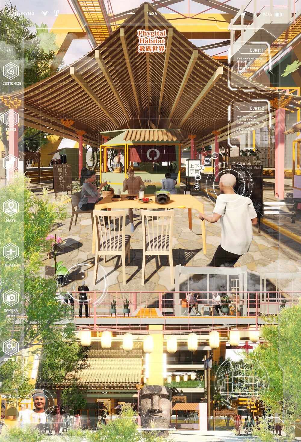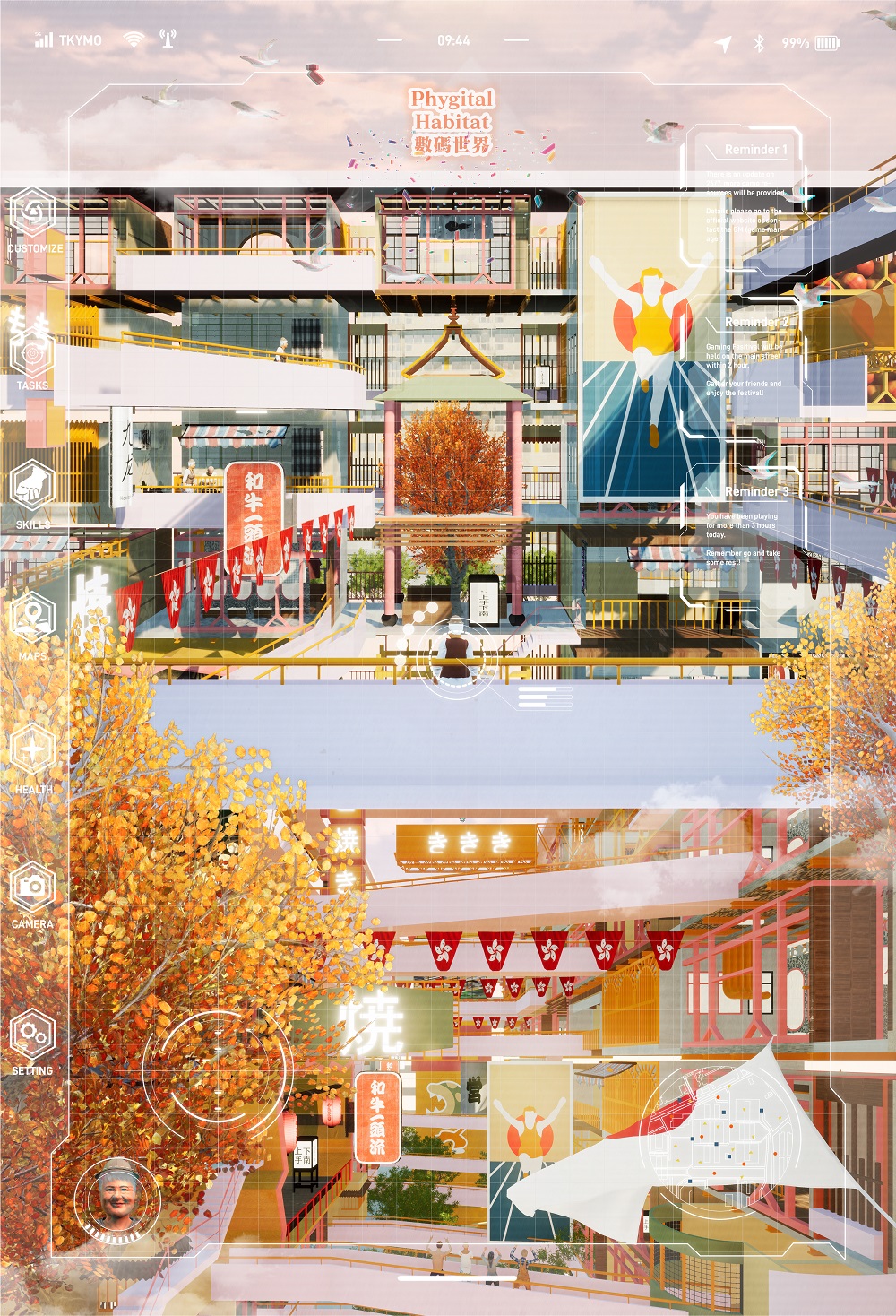 董偉賢的作品《Phygital Habitat》,聚焦在日本的「團地」建築上,董偉賢通過虛擬與現實的結合,用遊戲的手段展現社區活化的願景。在日本經濟騰飛時期,嬰兒潮和城市化發展導致住宅需求急劇增加,為了解決新增人口的居住問題,政府開始大批建設「集體住宅」—團地。如今的團地已經成為房子老、治安差、窮人紮堆的象徵,不少年輕人不願搬進團地居住,董偉賢的設計正是圍繞這個社區文化現象,以視頻的方式呈現社區活化的設想。