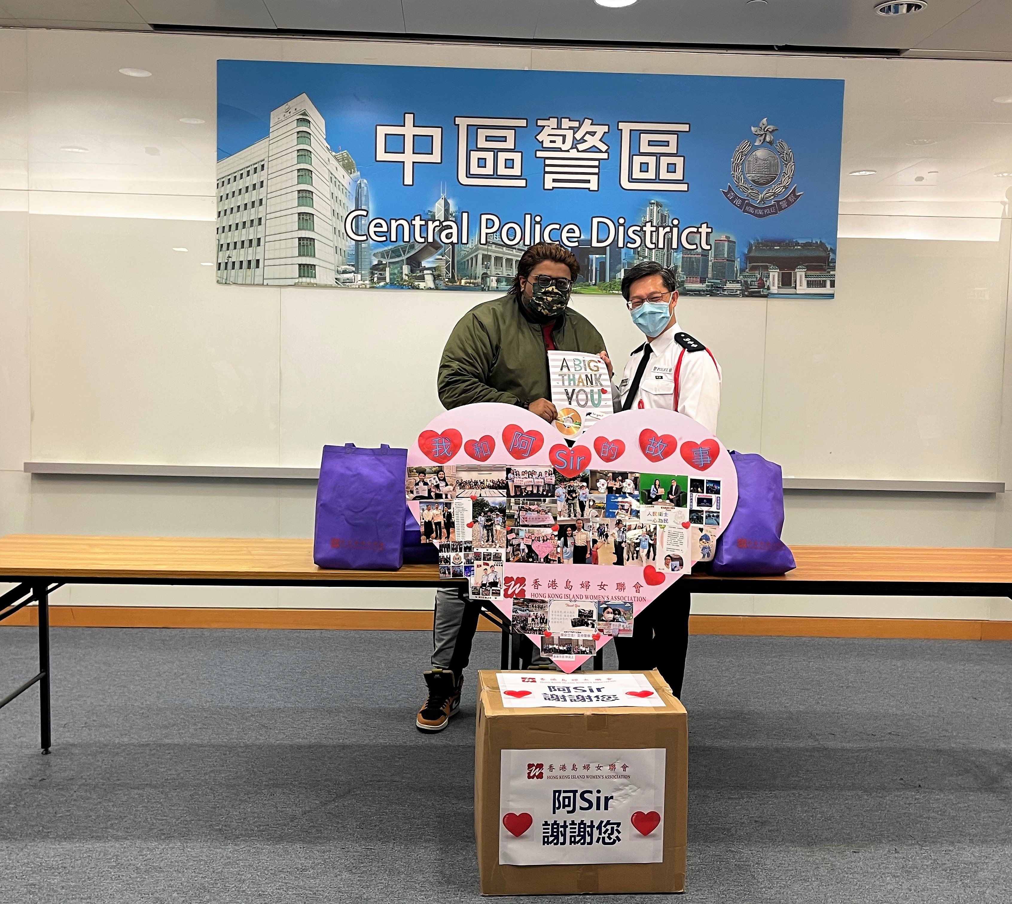 為把婦聯的心意與祝福送到警署,1日港島婦聯安排了半日三場的港島區警署慰問,行程十分緊湊。西區慰問中,陳巧莉、邱婕兒、劉江紅等向駐西區警署的警員們送上抗疫物資及精心製作的視頻DVD。在中區警署慰問中,中區警區指揮官林鴻釧總警司親自前來接見,趙華娟、程莉元及南亞裔的義工李浩誠等,把象徵著婦聯關愛與祝福的愛心照片牆送給總警司,出席的執委們現場朗誦了會員作的詩歌給警察加油打氣。與此同時,楊張新悅及楊哲安出席山頂警署慰問,會務拓展委員會主任沈貝嘉帶著兩個兒子一同前去,小朋友站在警察叔叔的面前,揮舞手中的「Thank you」手舉牌,高聲地說「謝謝您阿Sir」,場面非常感人。