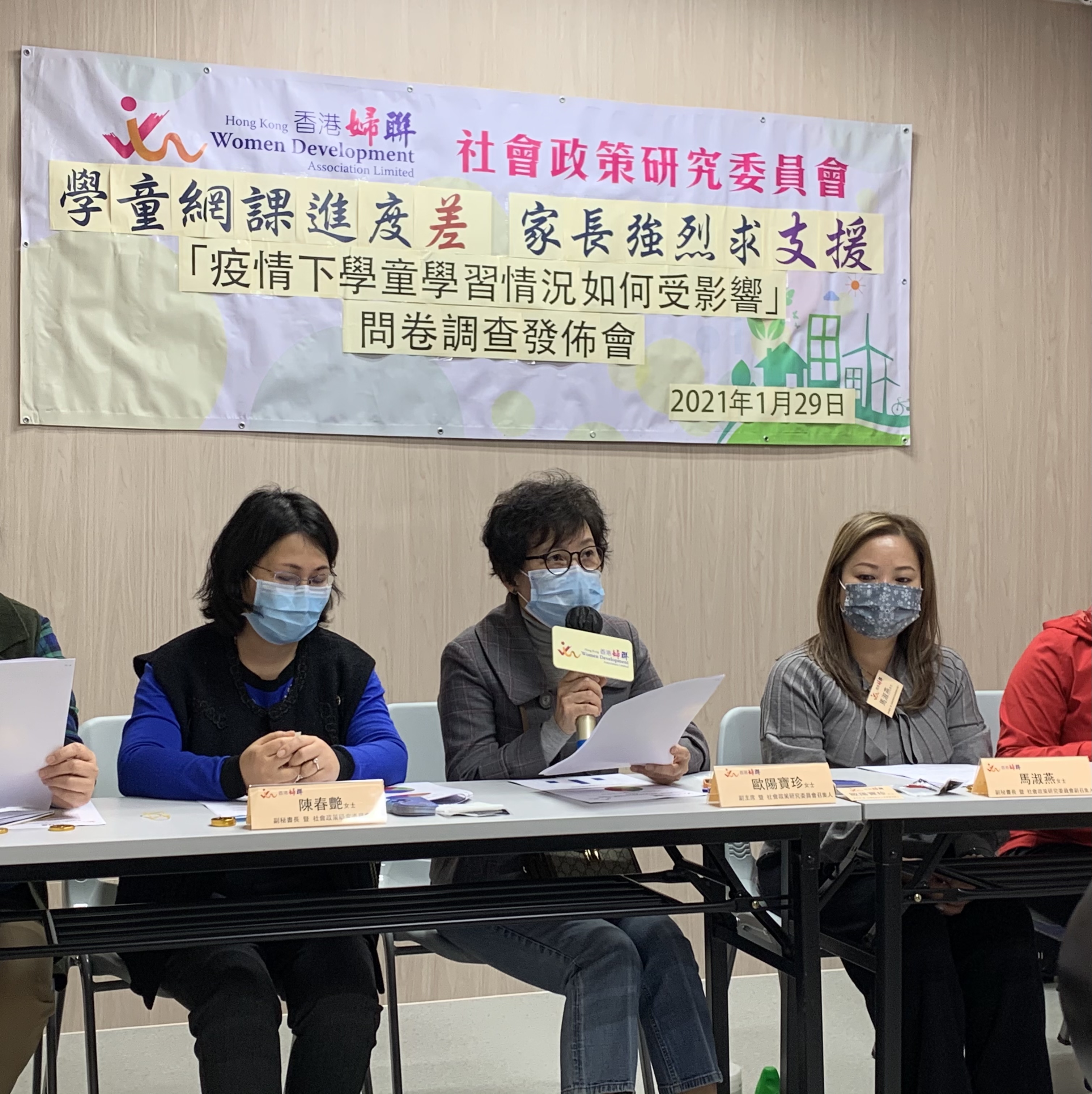 會上,有家長代表反映,網課給家庭帶來很大負擔,且對學童身心不利。學童獨自上網課使意外風險增加,整日在家缺乏正常社交活動,她呼籲社區能安排合資質的義工幫手解決。該會副主席歐陽寶珍強調,疫情下婦女權益更應受重視,政府可充分應用鄰里支援幼兒招股計劃,為有需要的家庭提供暫託服務。