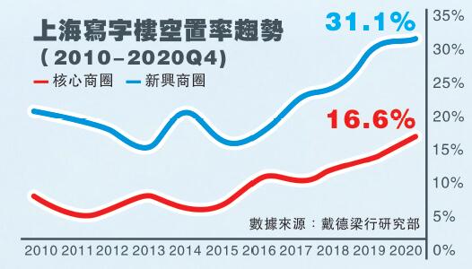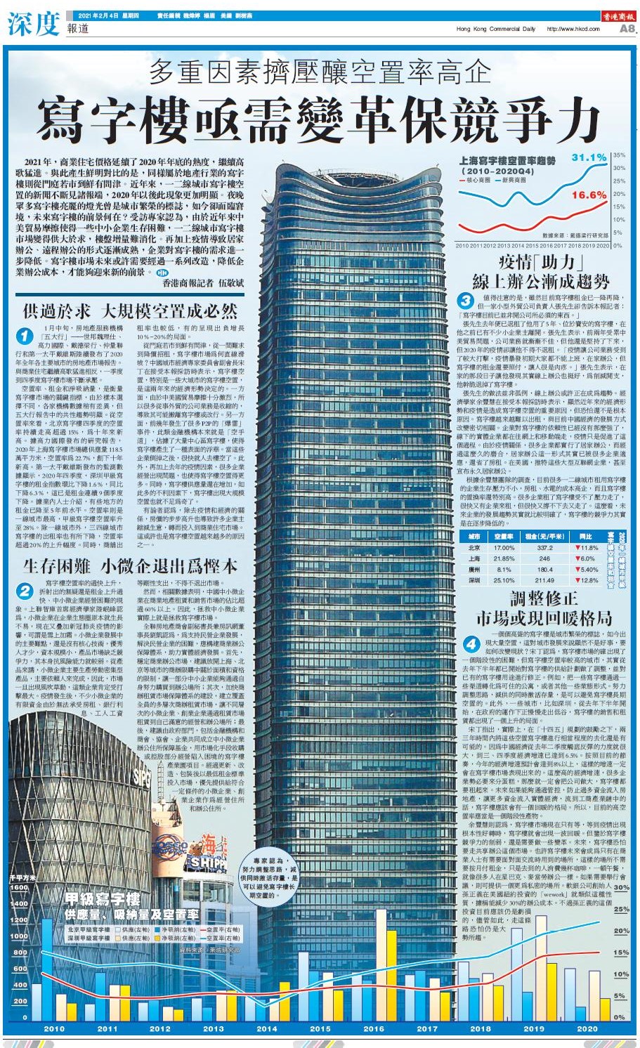 宋丁指出,實際上,在「十四五」規劃的鼓勵之下,兩三年時間內將這些空置寫字樓進行相當程度的去化還是有可能的。因為中國經濟從去年二季度觸底反彈的力度就很大,到三、四季度經濟增速已達到6.5%。按照目前的節奏,今年的經濟增速預計會達到8%以上,這樣的增速一定會在寫字樓市場表現出來的。這麼高的經濟增速,很多企業勢必要來分蛋糕,那麼就一定會把公司做大,寫字樓都要租起來。未來如果能夠通過管控,防止過多資金流入房地產,讓更多資金流入實體經濟,流到工商產業鏈中的話,寫字樓應該會有一個回暖的格局。所以,目前的高空置率應當是一個階段性產物。