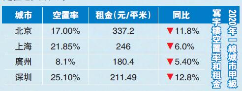 空置率、租金和淨吸納量,是衡量寫字樓市場的關鍵指標,由於樣本選擇不同,各家機構數據稍有差異,但五大行報告中的共性趨勢明顯。從空置率來看,北京寫字樓四季度的空置率持續走高超過15%,為十年來新高。據高力國際發布的研究報告,2020年上海寫字樓市場總供應量118.5萬平方米,空置率為22.7%,創下十年新高。第一太平戴維斯發布的監測數據顯示,2020年四季度,深圳甲級寫字樓的租金指數環比下降1.6%,同比下降6.3%,這已是租金連續9個季度下降。據業內人士介紹,有些地方的租金已降至5年前水平。空置率則是一線城市最高,甲級寫字樓空置率升至28%。除一線城市外,三四線城市寫字樓的出租率也有所下降,空置率超過20%的上升幅度。同時,商舖出租率也較低,有的呈現負增長10%-20%的局面。