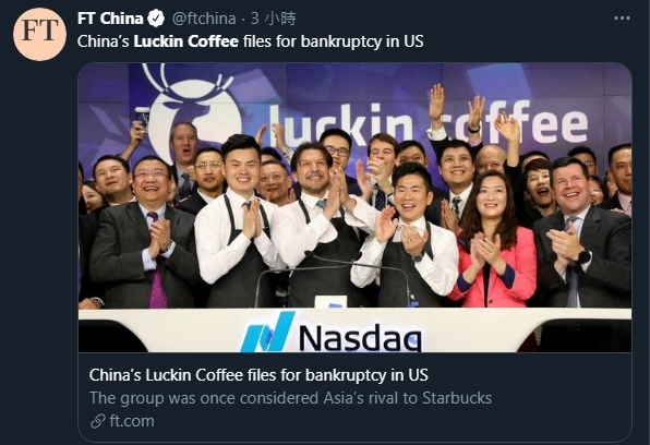 據英國金融時報報道,被曝偽造數億美元的銷售額後不到一年,瑞幸咖啡(Luckin Coffee)已在美國申請破產保護。