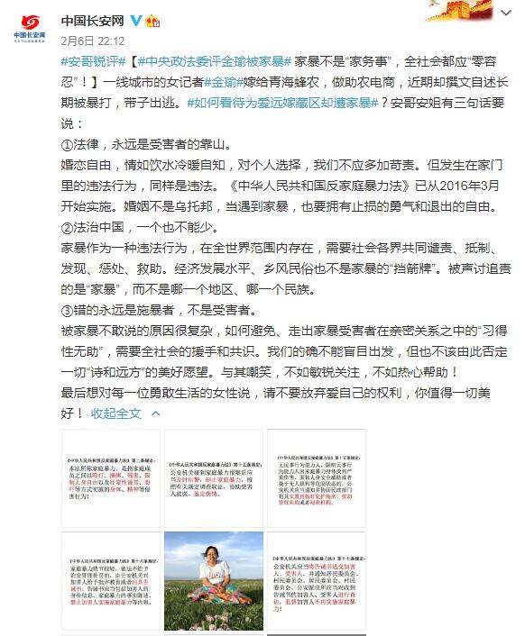 2月6日 ,以《另一個「拉姆」》為題的文章在網上引發關注,作者馬金瑜曾是一名媒体人,她在文章中自述情感經歷,稱長期遭丈夫家暴。據悉,青海當地公安部門已介入展開全面調查。同日,中央政法委網站官方微博「中國長安網 」針對此事發文,稱家暴不是「家務事」,全社會都應「零容忍」。