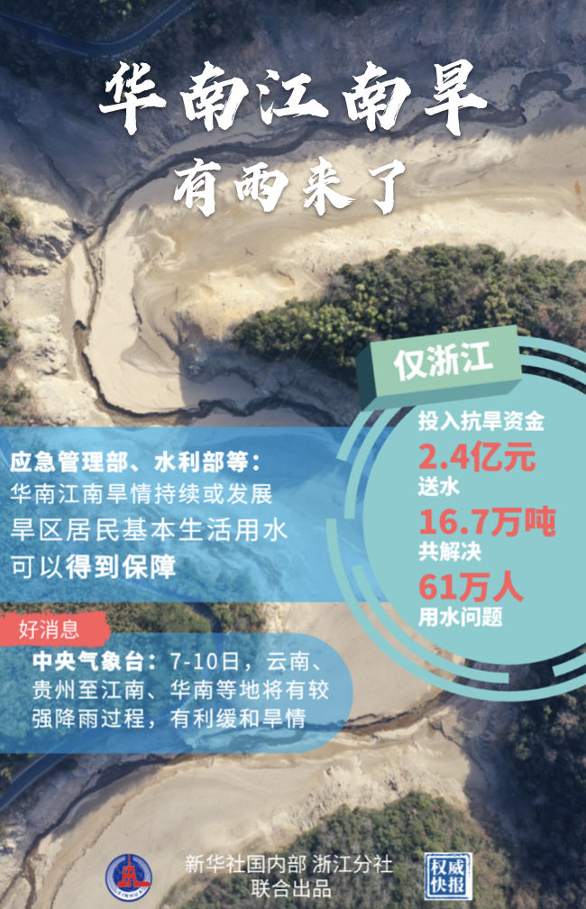針對近期華南、江南等地乾旱,應急管理部、水利部等表示,全國旱情較常年同期明顯偏輕,局地旱情較重,預計2月份,江南南部、華南等地降水偏少2-5成,江南中南部氣溫偏高1-2℃,華南、江南部分地區乾旱持續或發展。經過採取多項措施,部分地區需要採取限時、限量、限壓供水等應急措施,旱區居民基本生活用水可以得到保障。